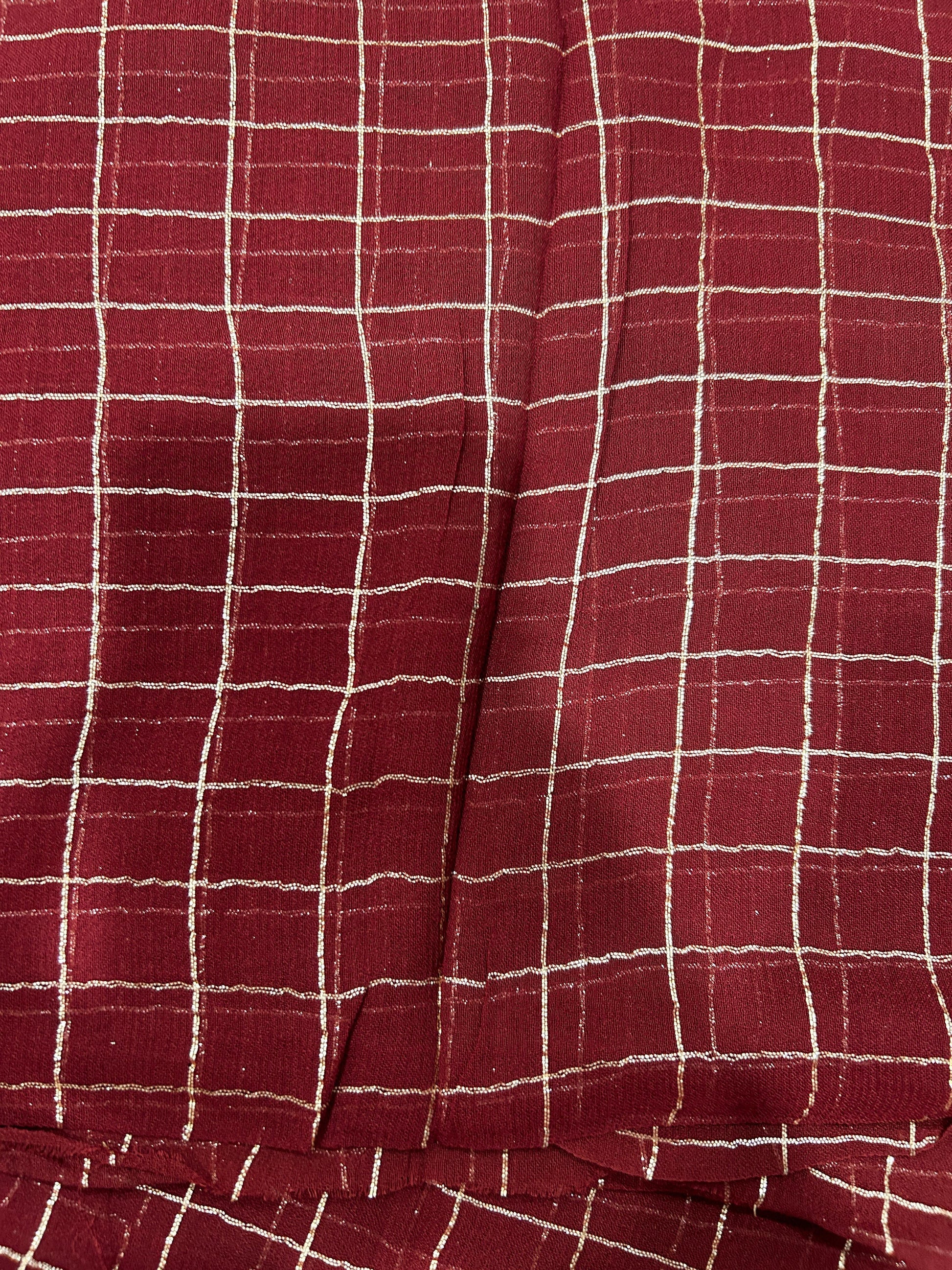 The Chandramukhi saree radiates classic allure, draped in a rich maroon red viscose fabric that offers a soft yet lustrous fall. The borders are highlighted with golden zari woven into an elegant check pattern, giving the saree a structured regal appeal. Simple yet grand, this piece is perfect for weddings, festive celebrations, and traditional gatherings where understated opulence makes the boldest statement.