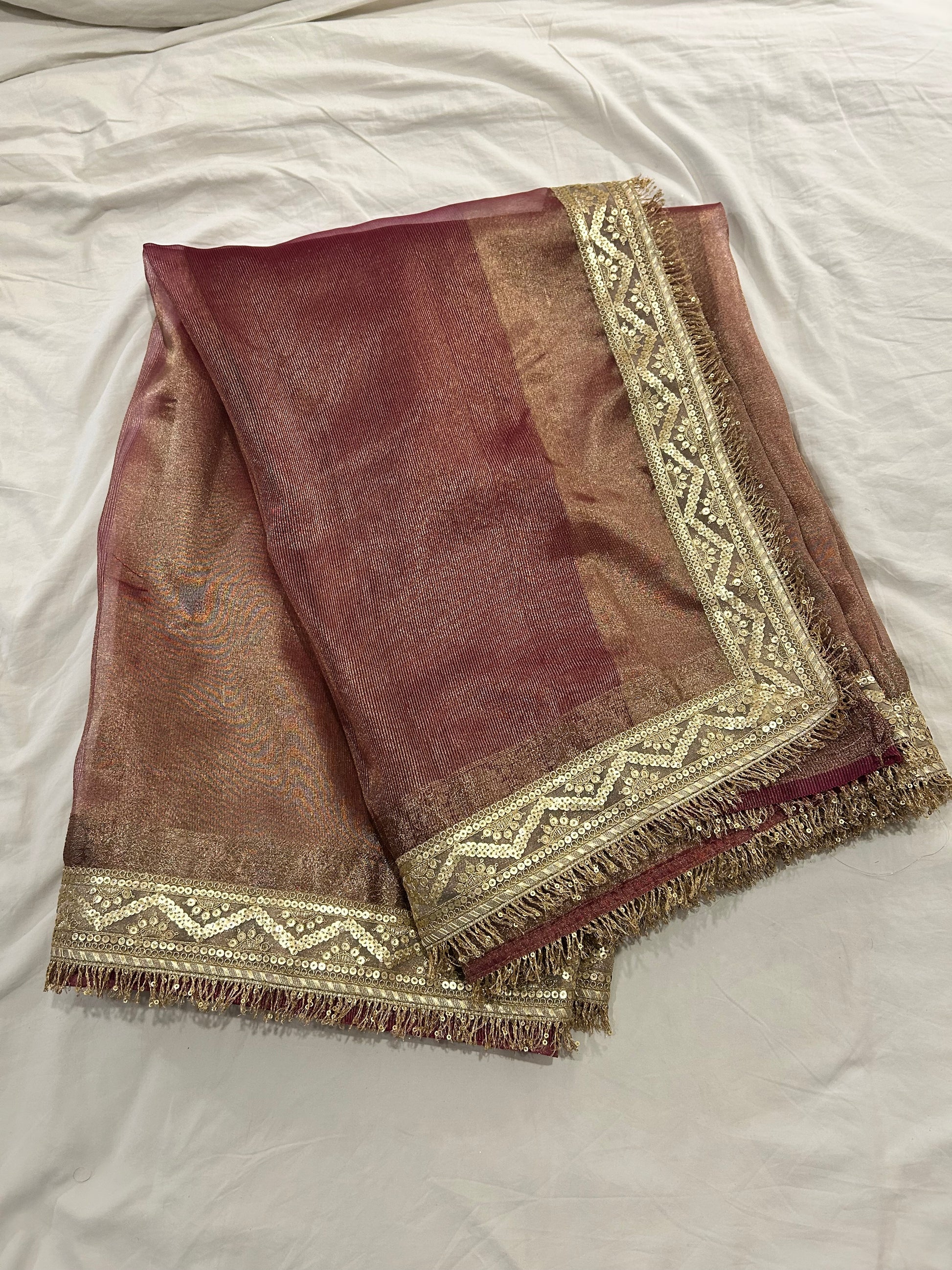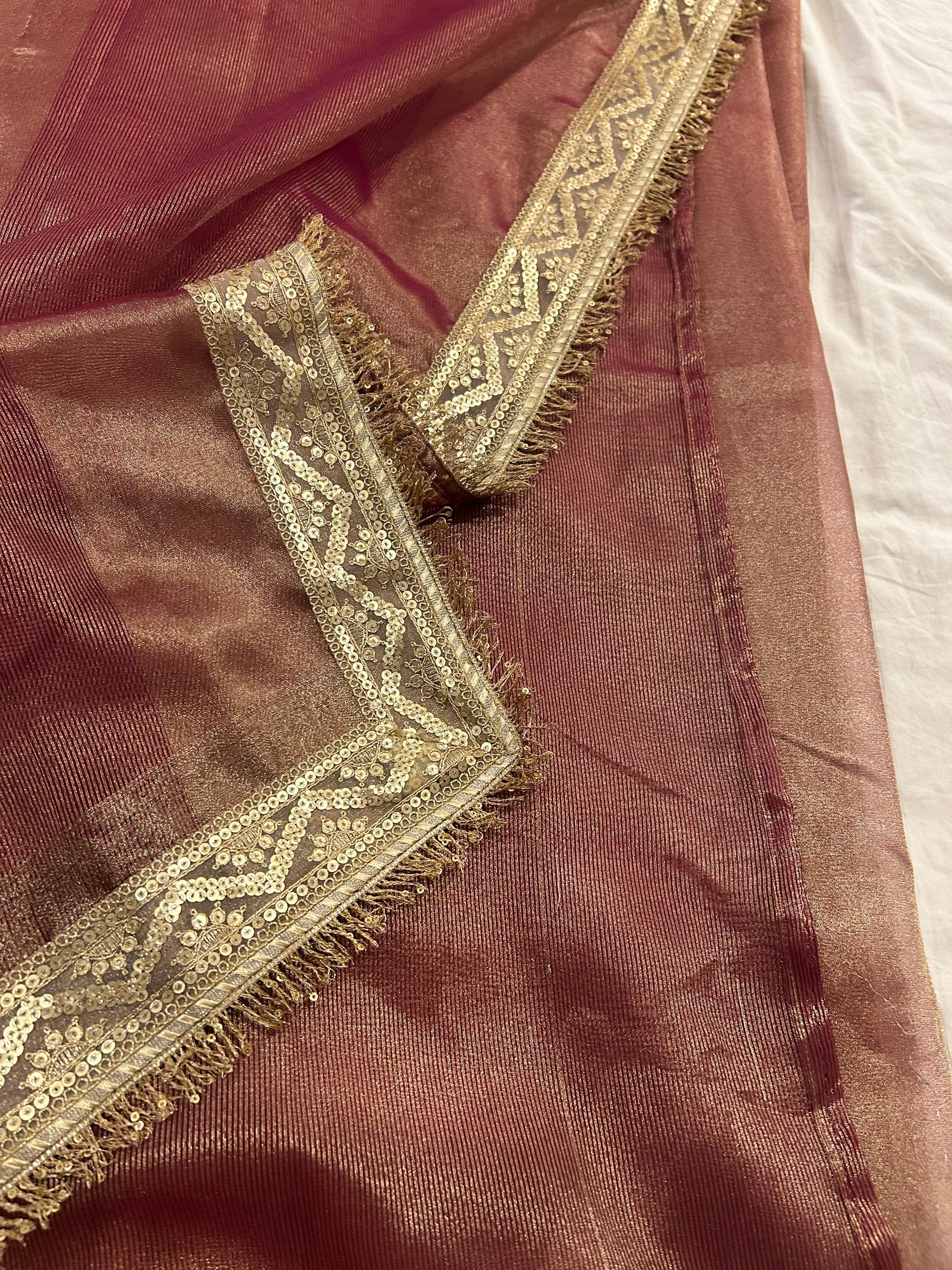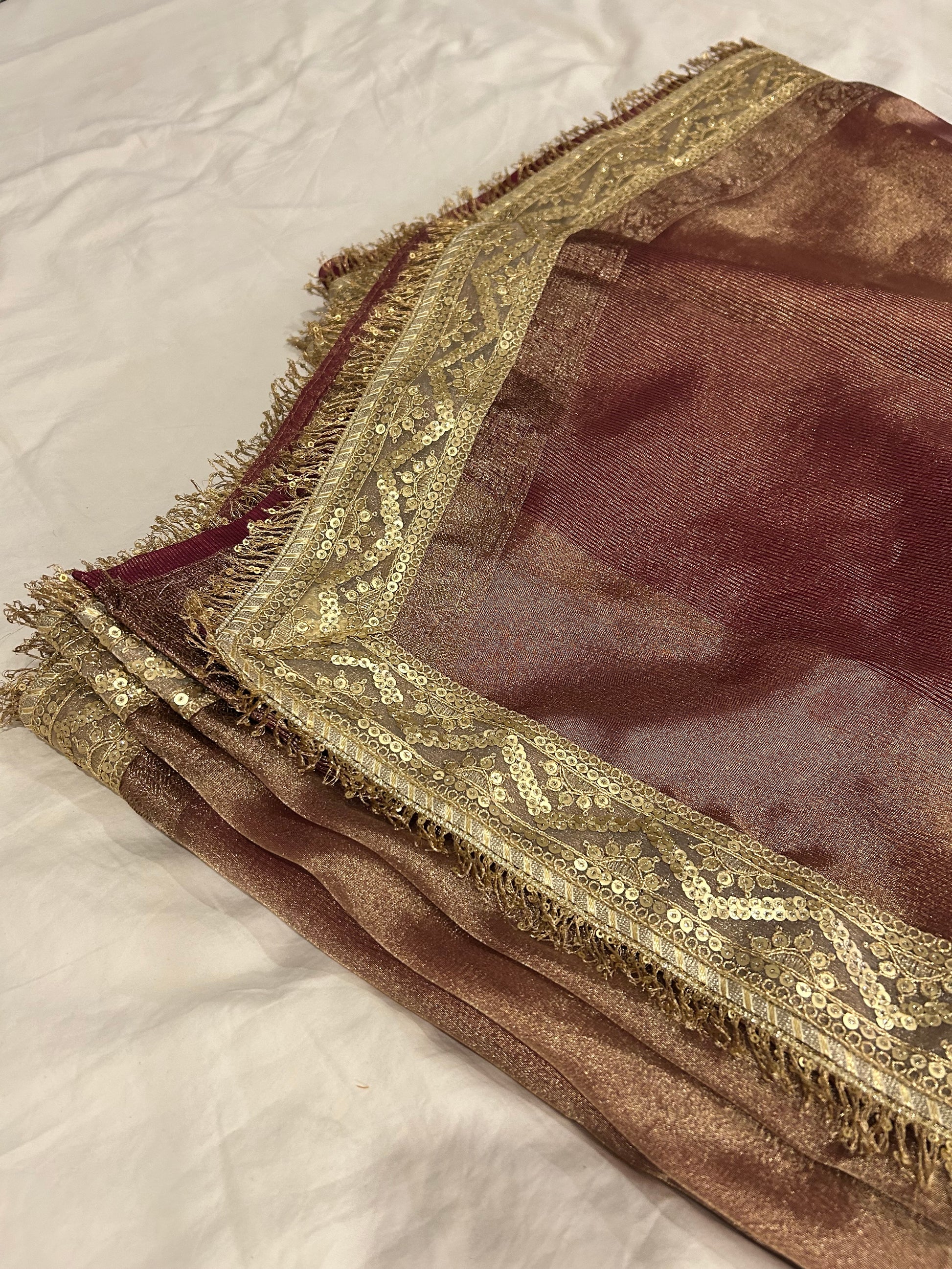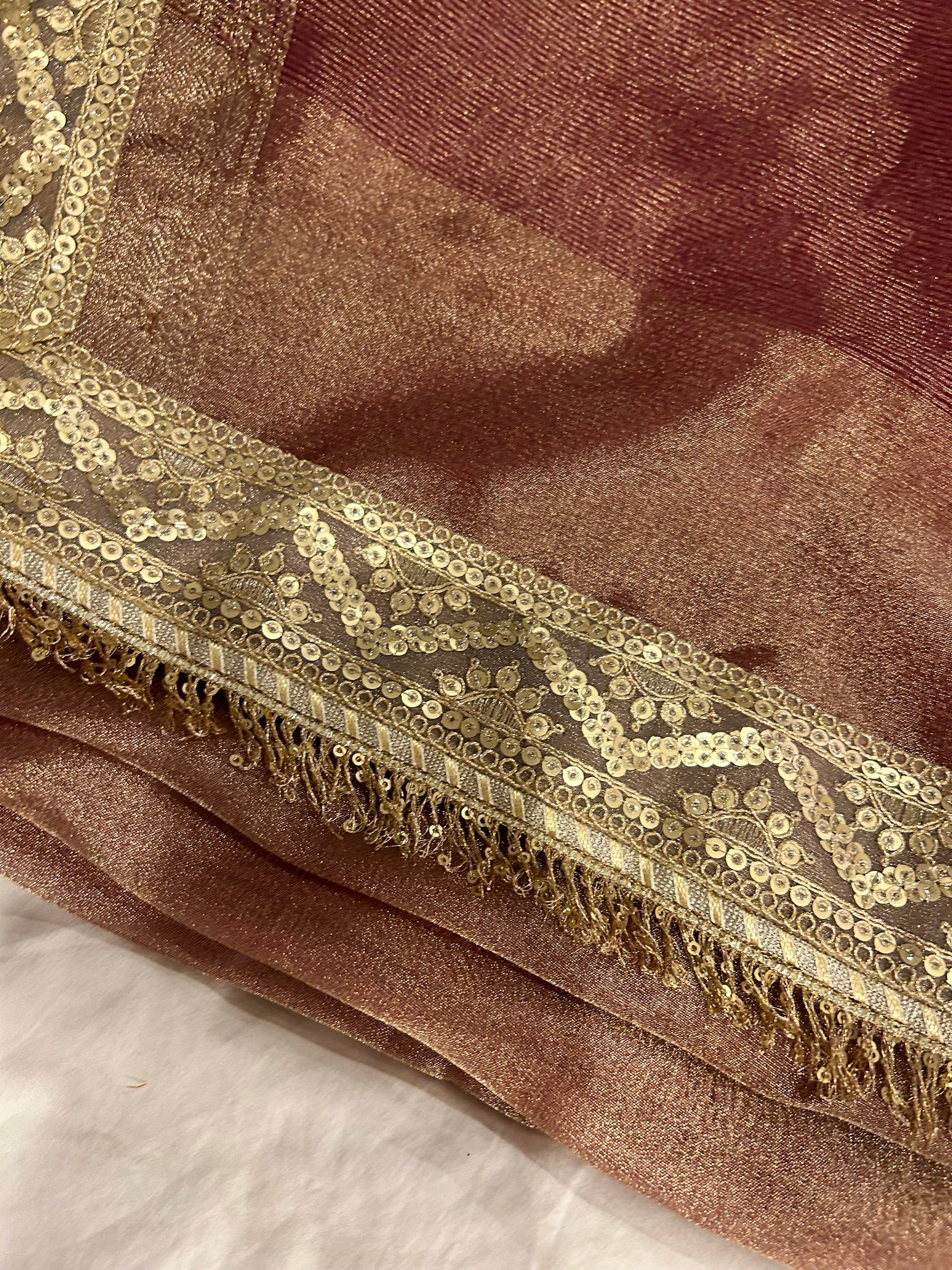 Introducing "Gul-e-Nazakat" tissue saree is a stunning embodiment of delicate beauty and refined elegance, which translates to "Delicate Rose," perfectly captures the essence of this exquisite saree. Crafted from the finest tissue silk, the saree boasts a rose brown hue that exudes sophistication and grace. The fabric shimmers subtly, catching the light in a way that adds a soft, ethereal glow to your appearance.