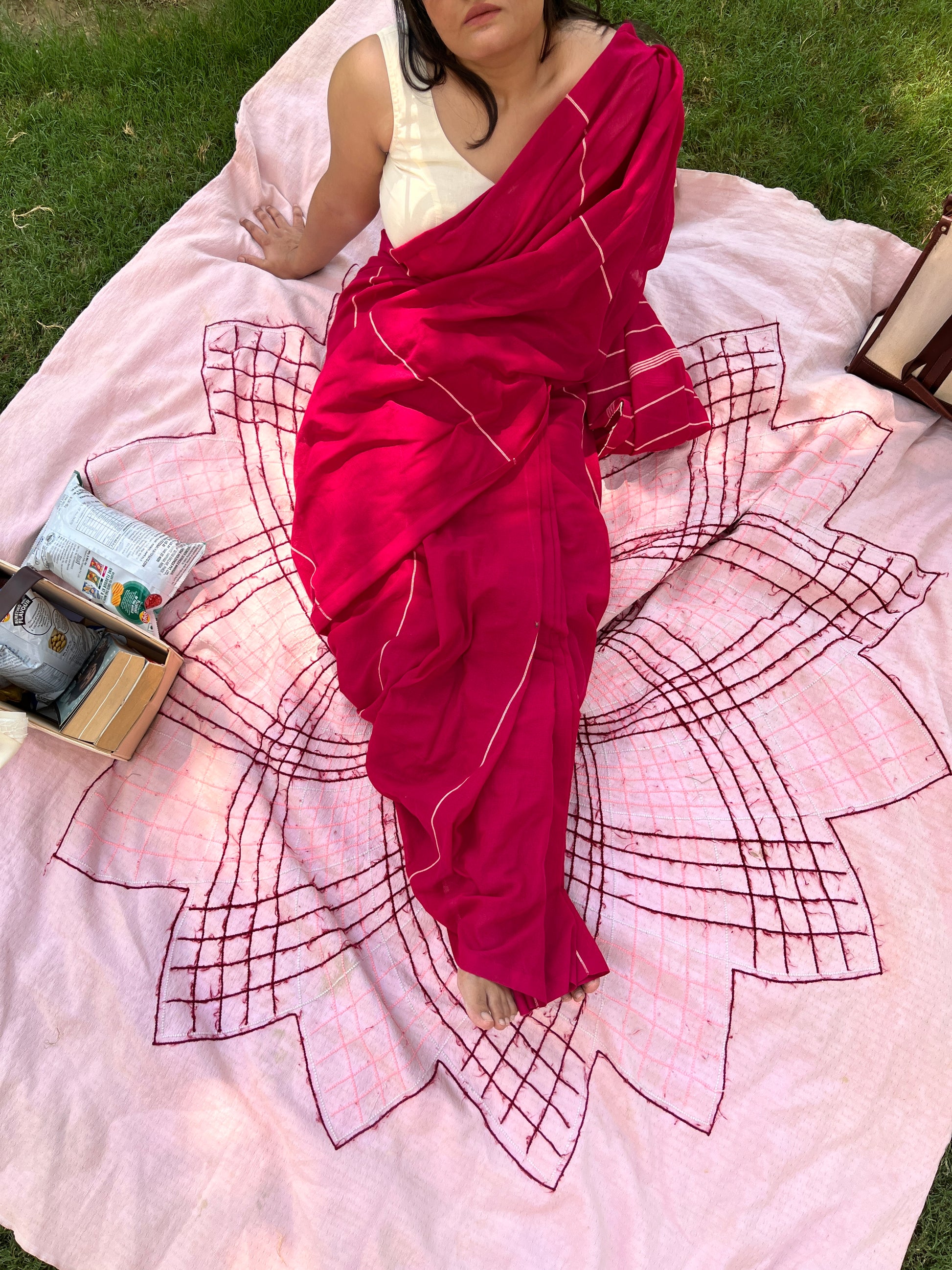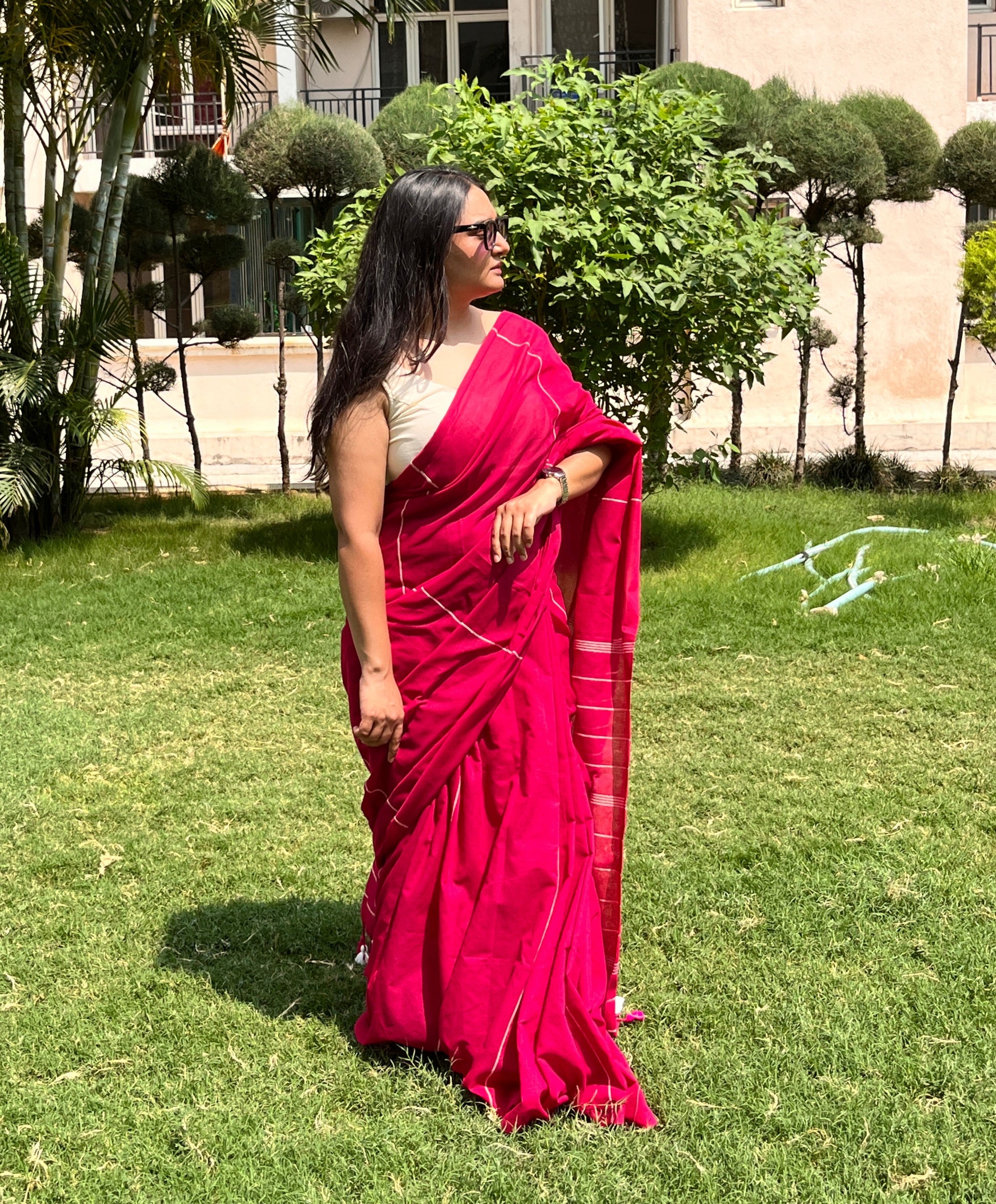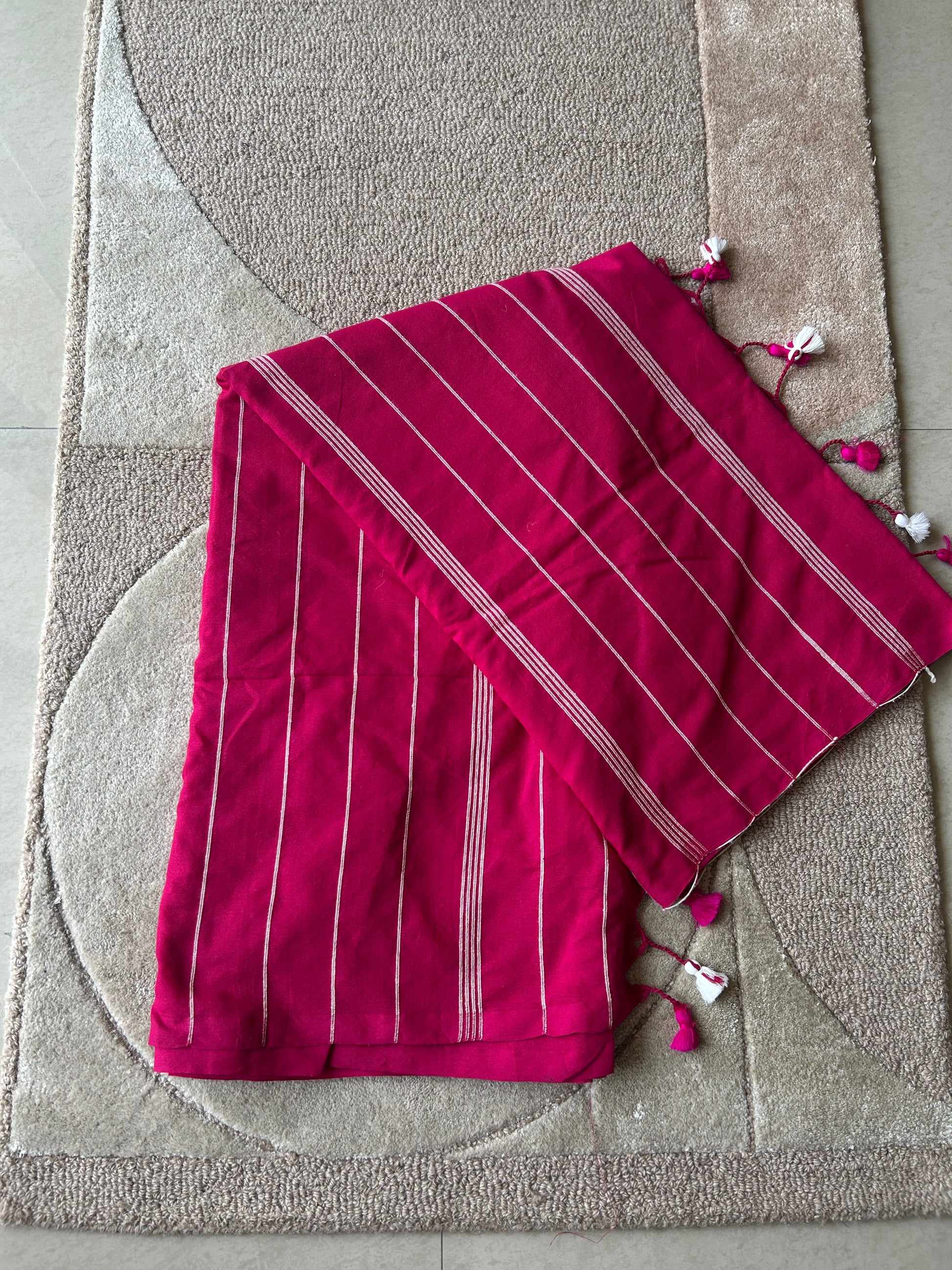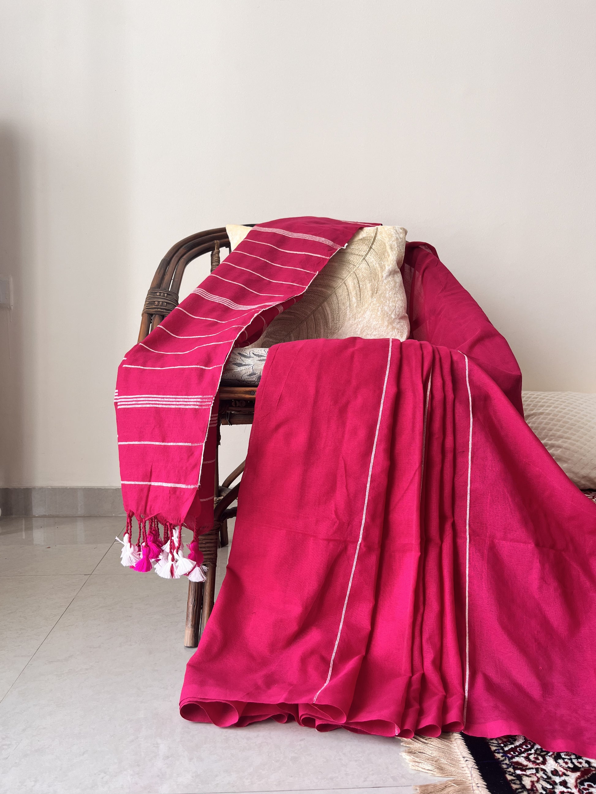 Celebrate minimal elegance with this stunning deep pink saree, handwoven in soft, breathable cotton. The saree features delicate white resham (thread) lines running vertically and horizontally across the body and pallu, creating a graceful linear design that highlights its artisanal charm.