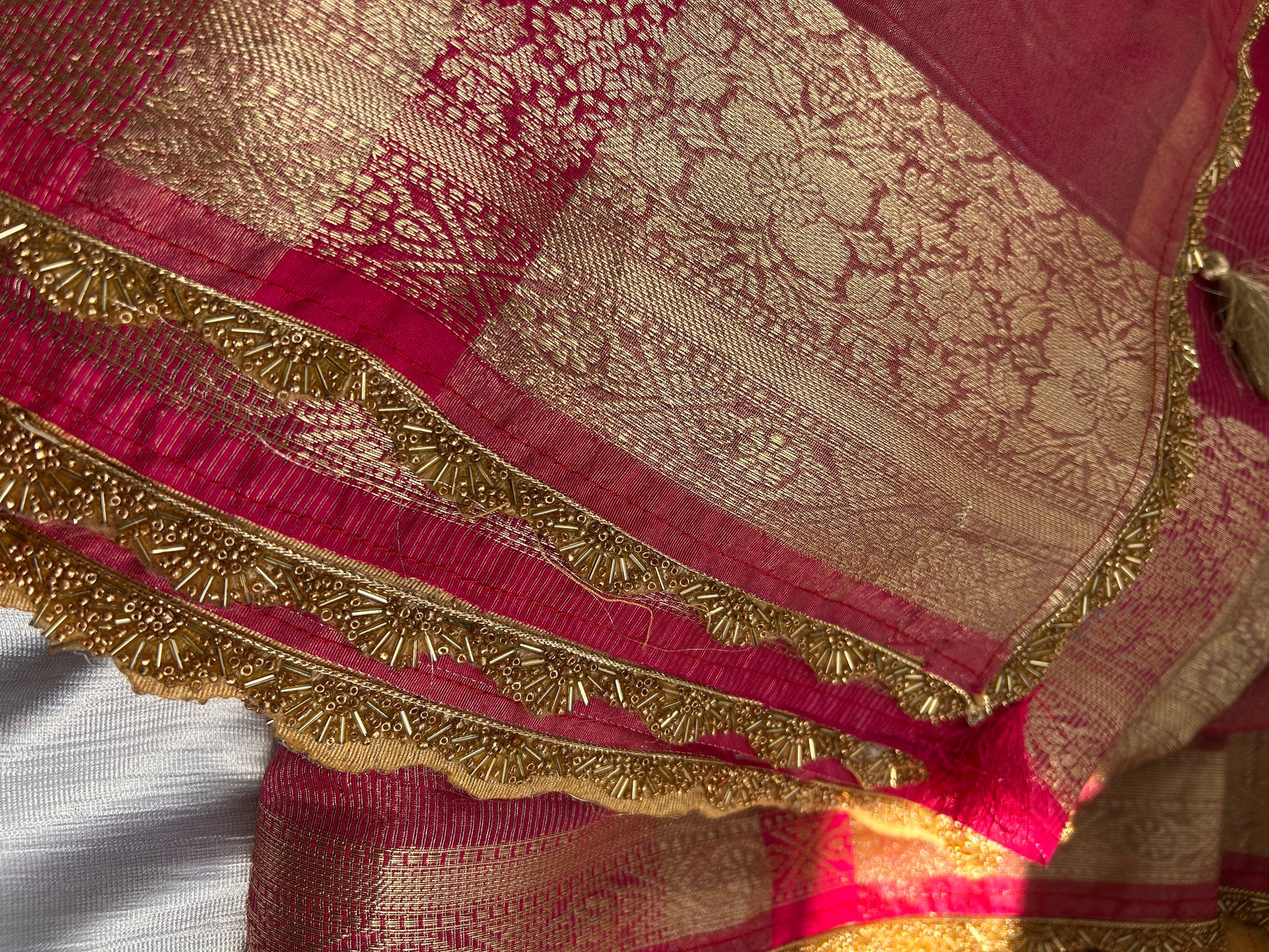 The Gulrukh saree is a celebration of delicate beauty and timeless artistry. Draped in a soft pink tissue silk, its luminous fabric is highlighted with golden horizontal stripes that add a refined shimmer to the drape. The saree is finished with fan-style lace along the borders and playful tassels on the pallu, creating a perfect balance of elegance and charm. Ideal for festive gatherings, weddings, or graceful evening looks, this saree is a must-have for your luxury wardrobe.
