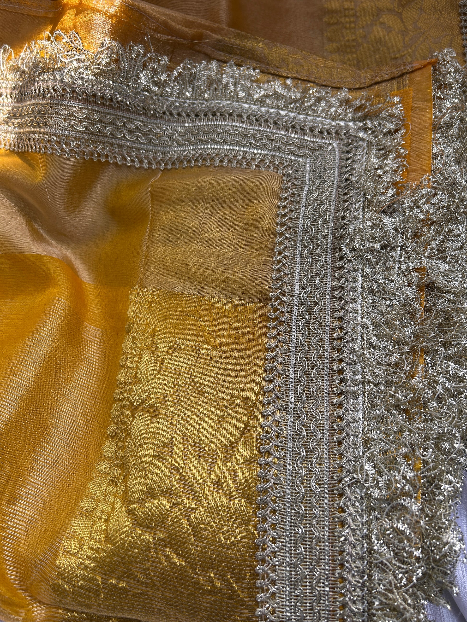 Embrace the radiant glow of tradition with our Jahanara Tissue Silk Saree. This stunning piece, woven from luxurious tissue silk, is a cascade of warm, golden hues that glimmer and shine with every movement. Intricate silver gota Patti work adorns the borders, creating a striking contrast and adding a touch of classic elegance. This shimmering detail catches the light, enhancing the saree’s opulence and making it a perfect choice for festive occasions, weddings, or any event where you want to make a lasting impression.
