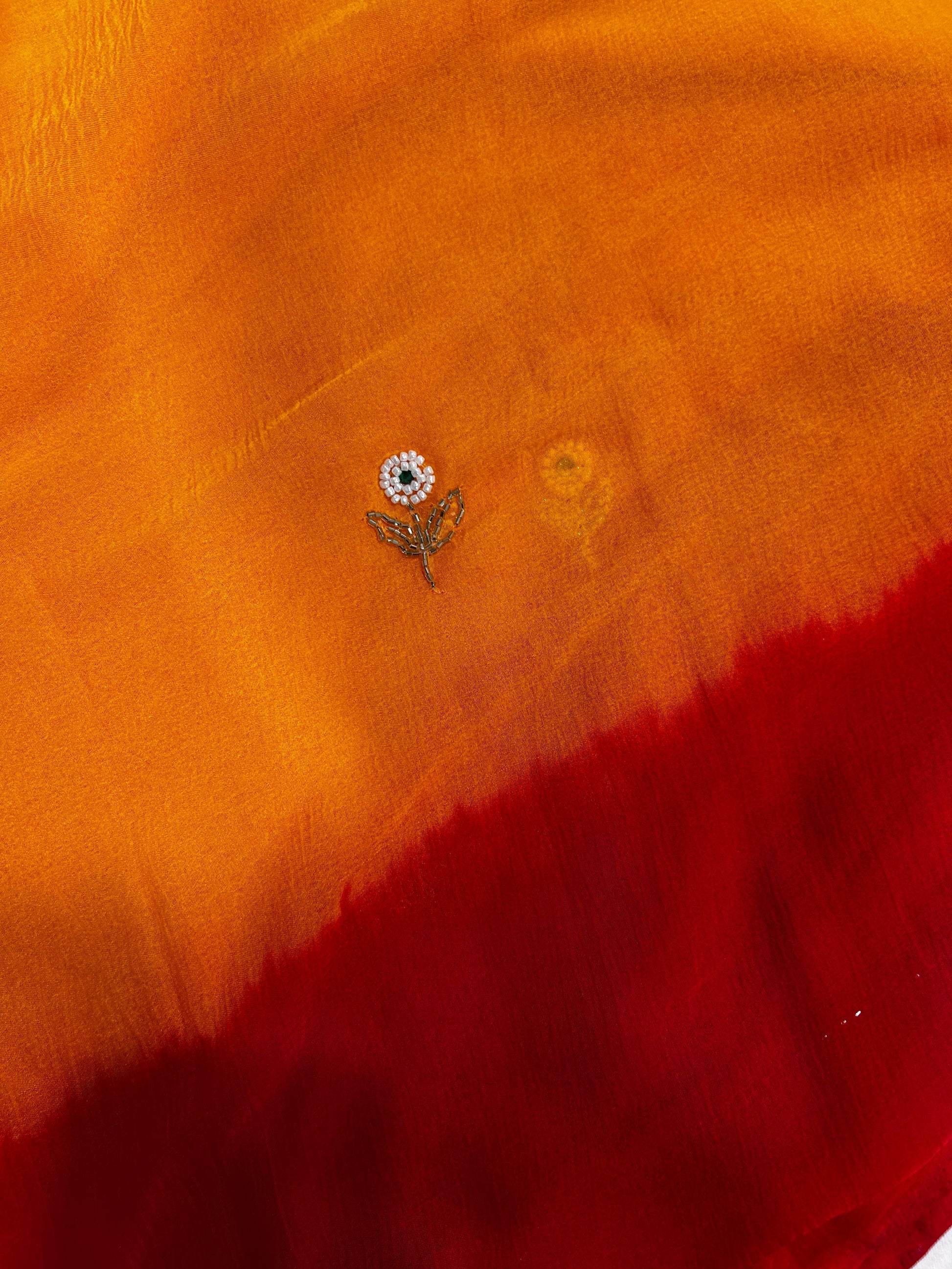 The Kesar saree blossoms with vibrant charm, crafted in airy pure chiffon that flows with effortless grace. Set in a striking combination of bright yellow and red, the saree is hand-embroidered with delicate floral motifs, accented by pearls and sequins for a subtle shimmer. Lightweight yet opulent, this saree is perfect for festive occasions, sangeet nights, and celebrations where elegance meets liveliness.