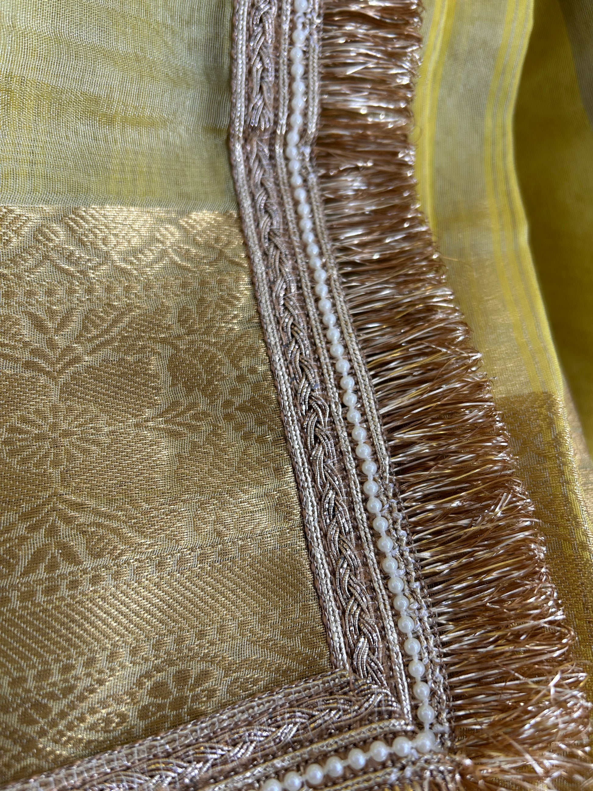The Padmini saree glows with radiant charm, woven in lime yellow tissue silk that shines with a subtle, elegant sheen. Golden horizontal stripes flow across the body, adding sophistication and depth to the fabric. The border is adorned with delicate pearl jallar lace, infusing the drape with timeless grace and finesse. Light yet luxurious, this saree is the perfect choice for festive occasions, haldi ceremonies, and summer weddings.