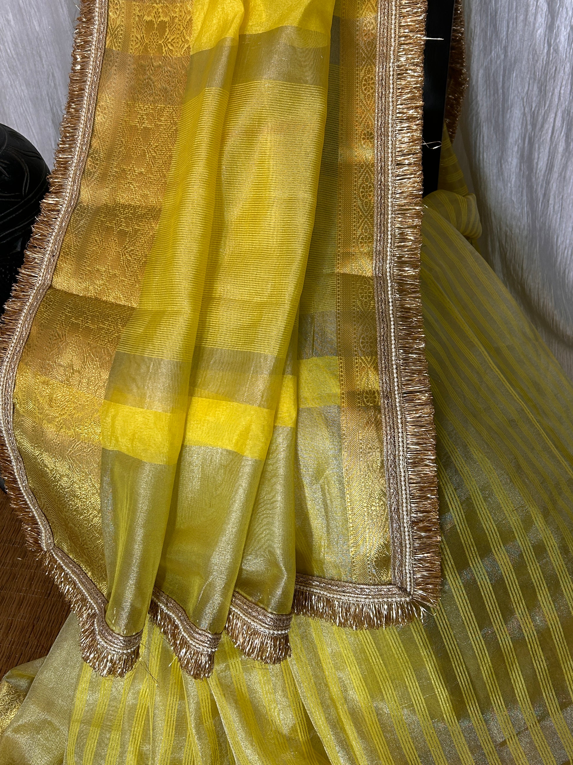 Color: Vibrant Lime Yellow with Golden Stripes & Pearl Jallar Lace