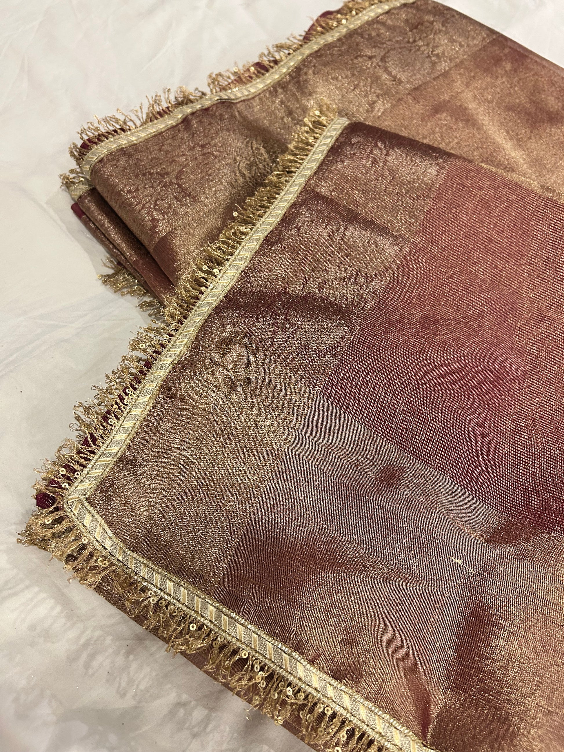 Introducing the Elegant "Rosy Rang" Rose Brown Saree. The delicate rose brown hue, lighter than its counterpart, adds a touch of gentle elegance and femininity. The Rosy Delight saree is adorned with a thin zari border that provides a hint of shimmer without overwhelming the delicate fabric.