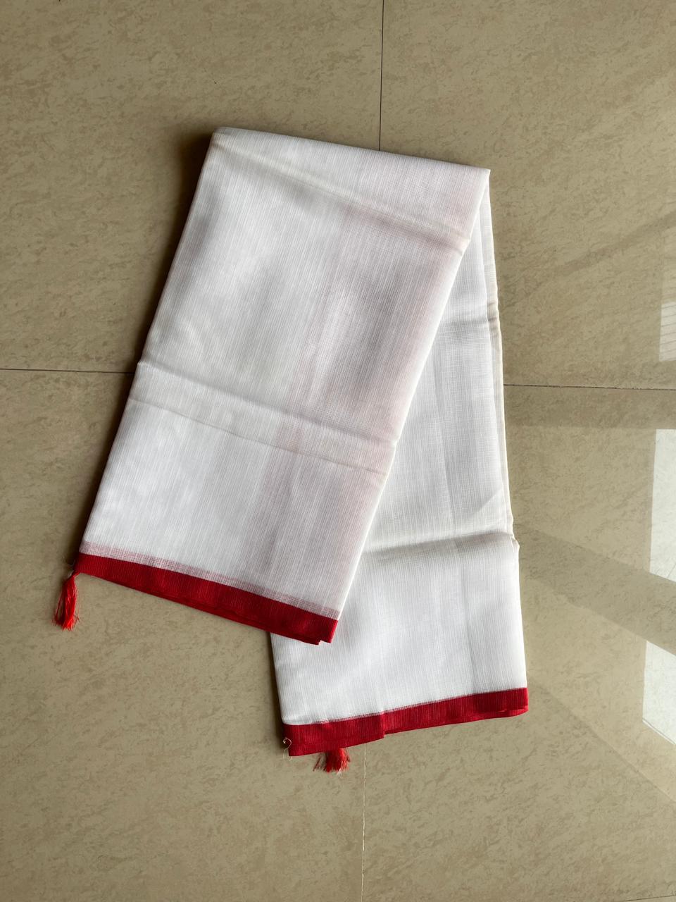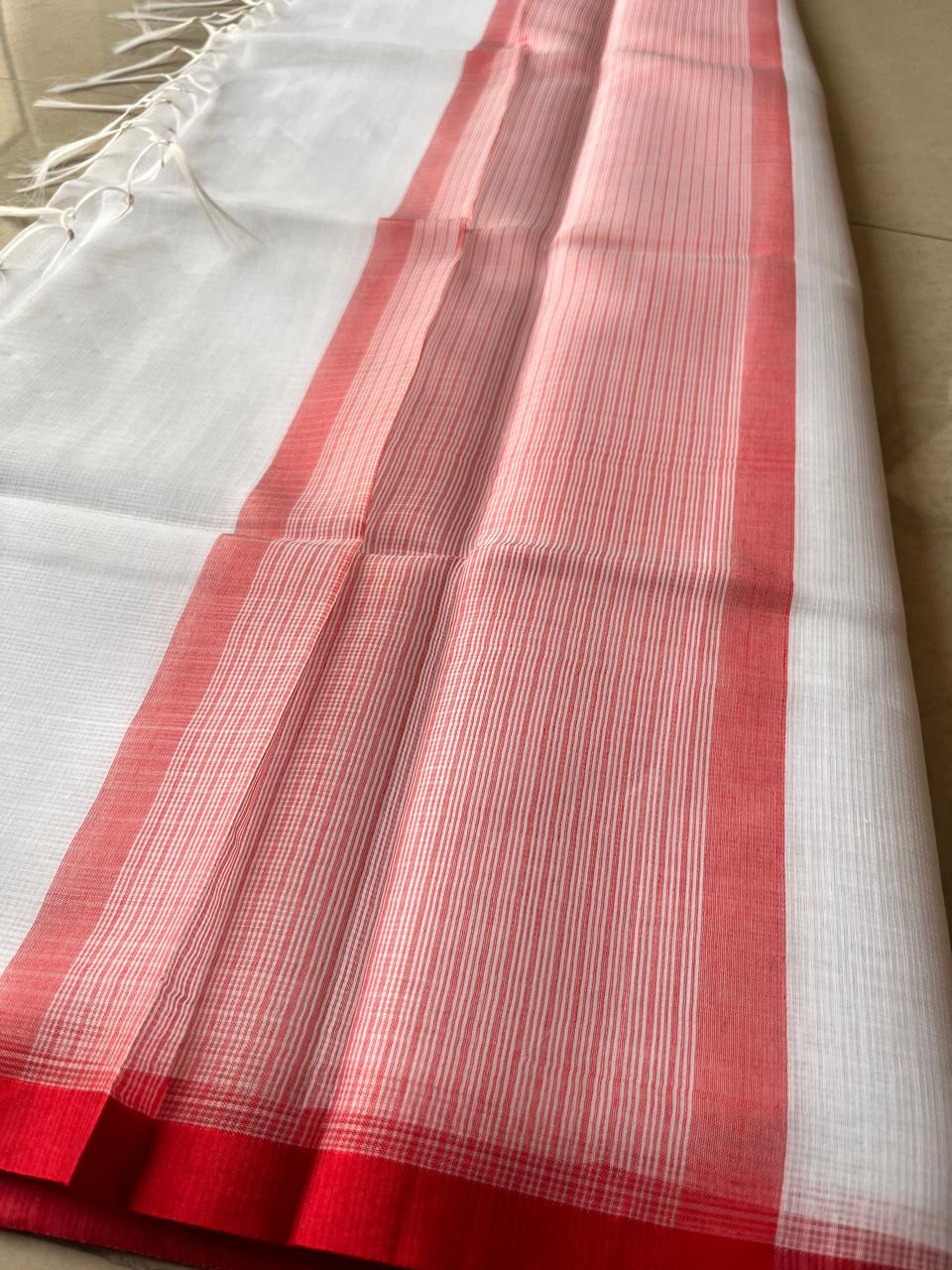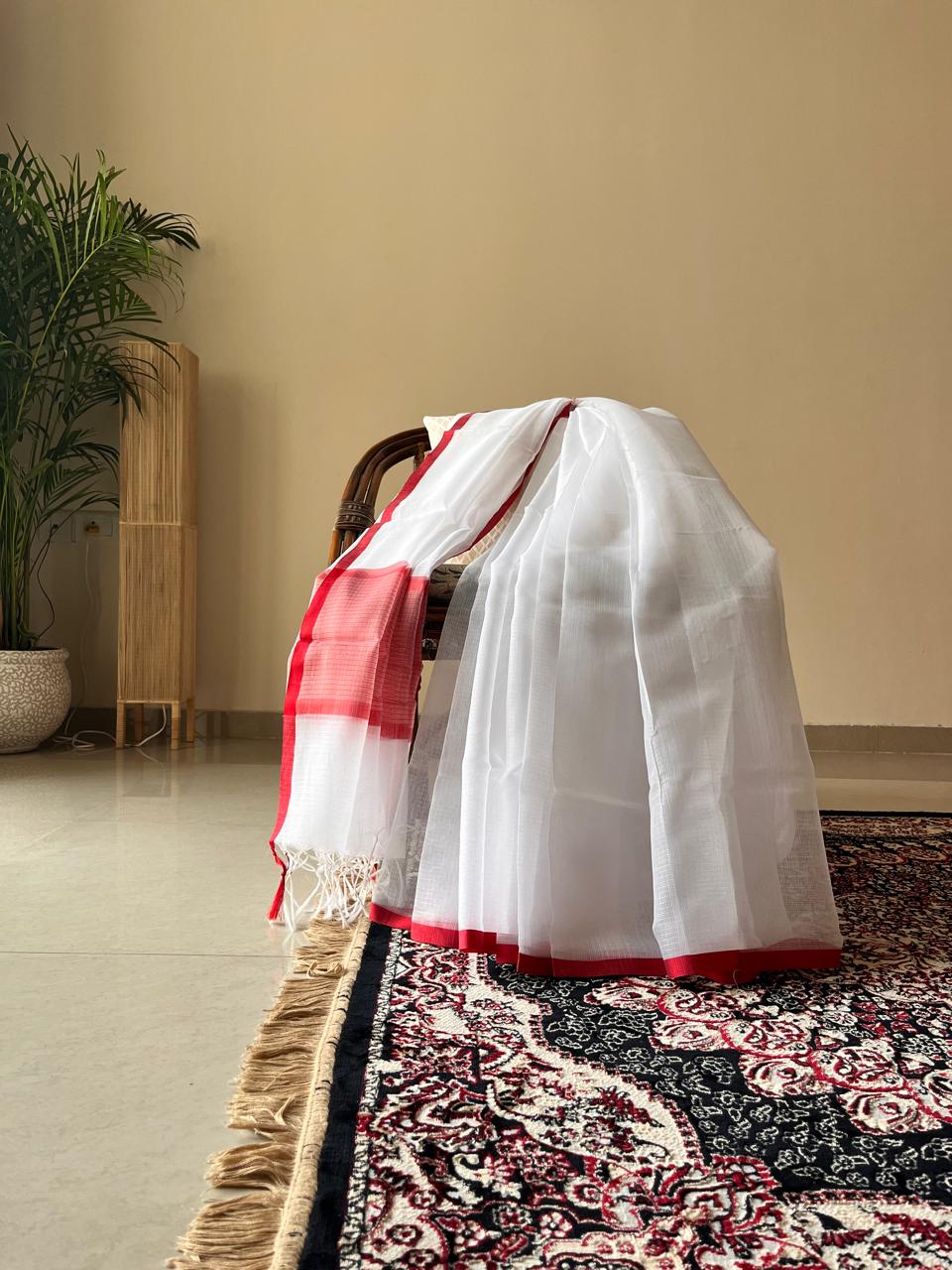 Elevate your summer style with our Crimson Whisper Kota Doriya Saree, a perfect blend of tradition and elegance. Crafted from the finest Kota Doriya fabric, this saree is known for its sheer, airy texture, making it an ideal choice for warm weather. The classic white base is beautifully complemented by a striking red border, adding a touch of vibrant contrast.