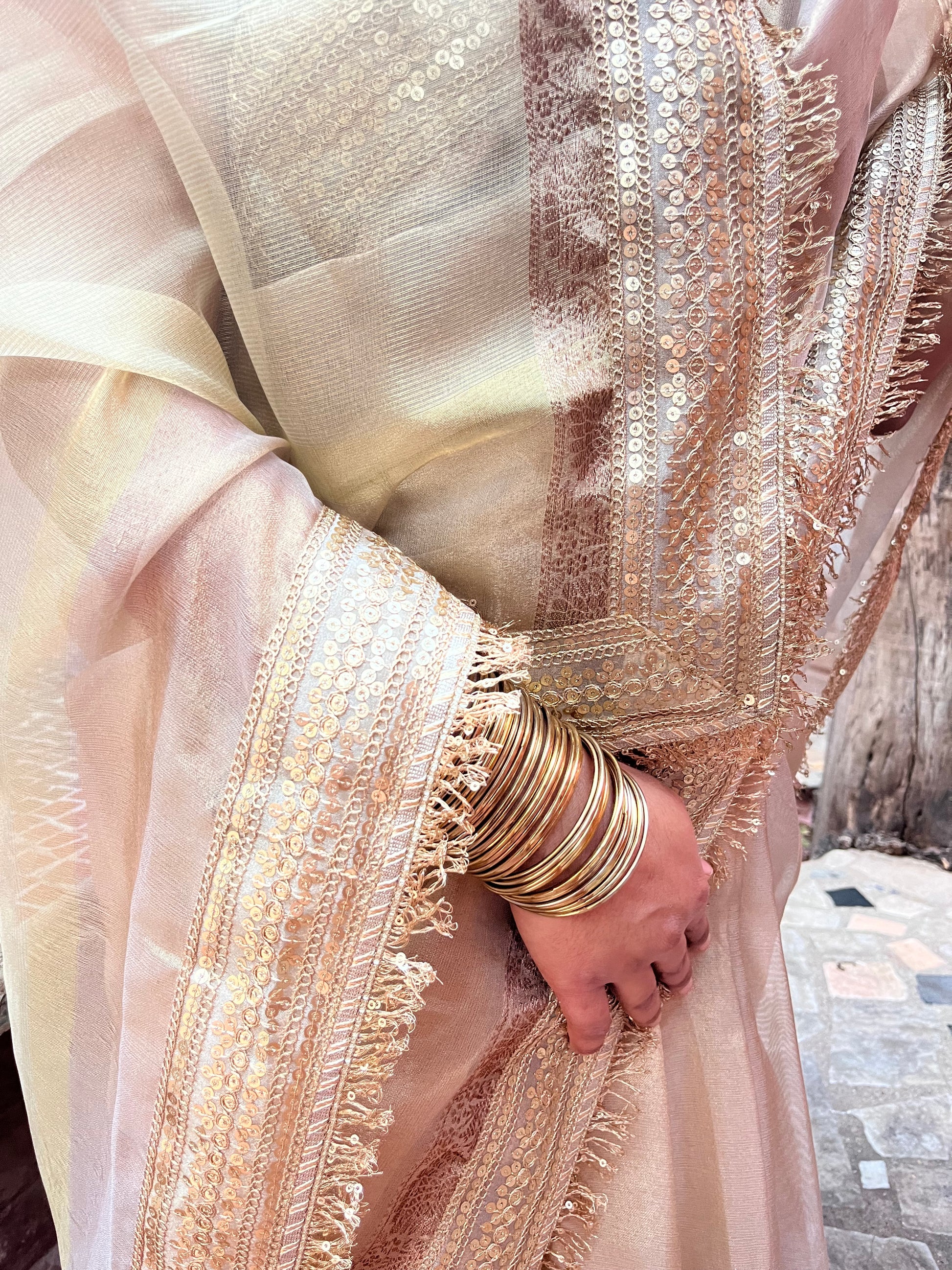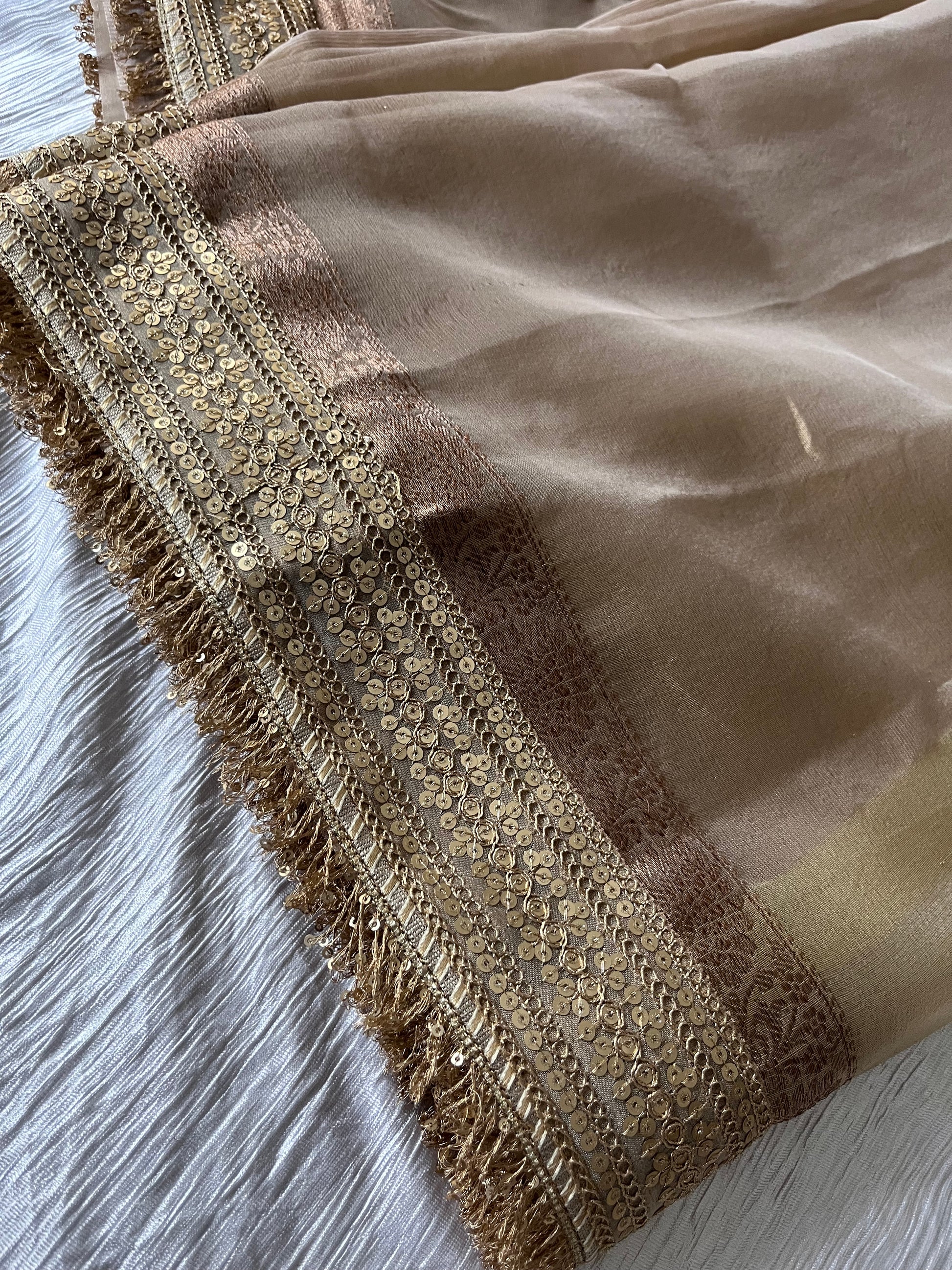 The saree is adorned with a graceful lace-bordered design, amplifying its regal aesthetic. The delicate shimmer of Tissue Silk paired with the soft champagne tone ensures you make a statement wherever you go, radiating poise and timeless beauty.