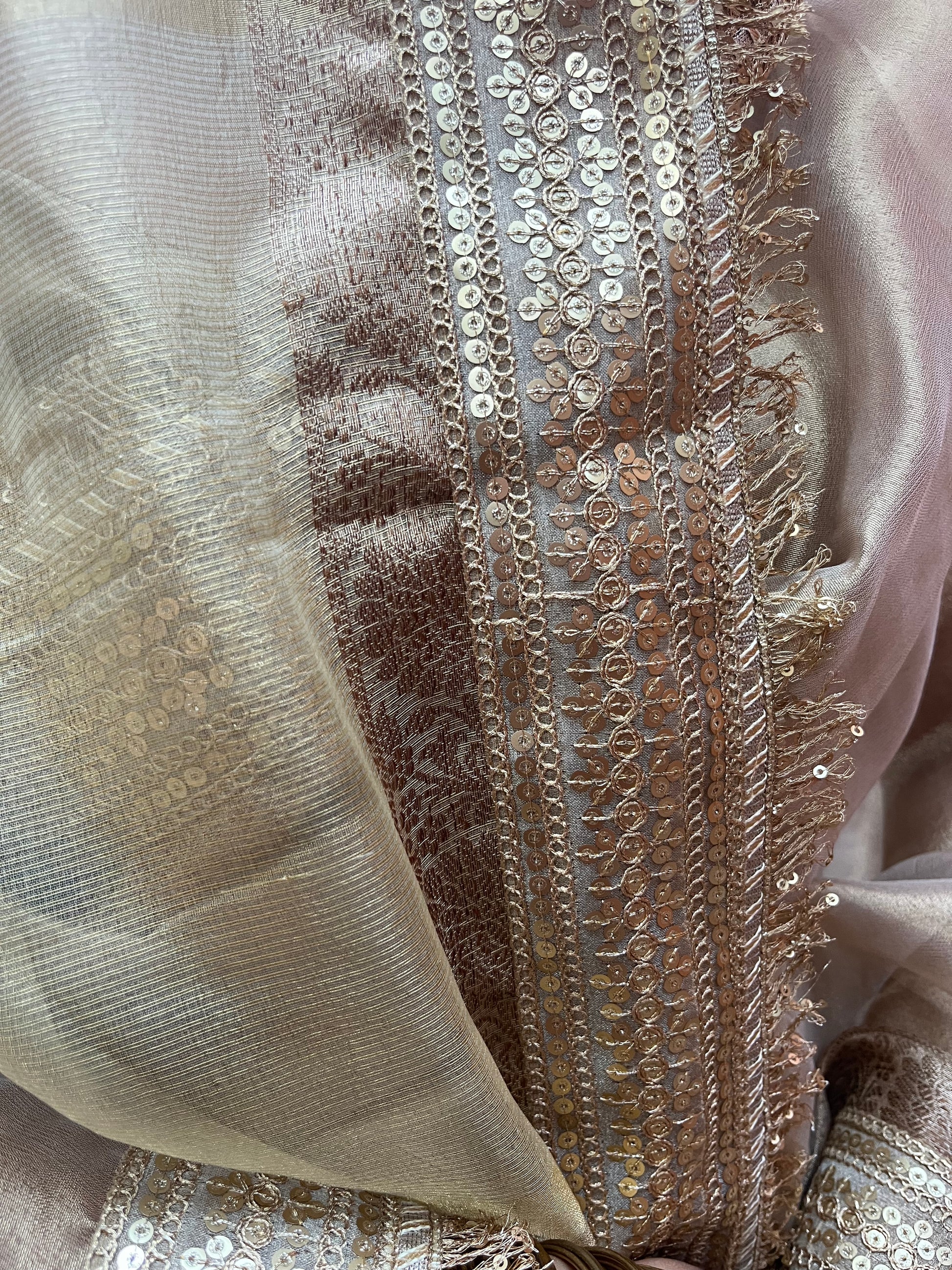 Experience the sheer luxury and grace of Shaam ki Rangat, a breathtaking masterpiece crafted from exquisite Tissue Silk fabric. This elegant saree, in a radiant champagne hue, embodies the sophistication and charm of royal heritage. Perfectly designed for the modern woman who cherishes tradition, this saree is ideal for weddings, festivals, and grand celebrations, offering a perfect blend of luxury and intricate artistry.