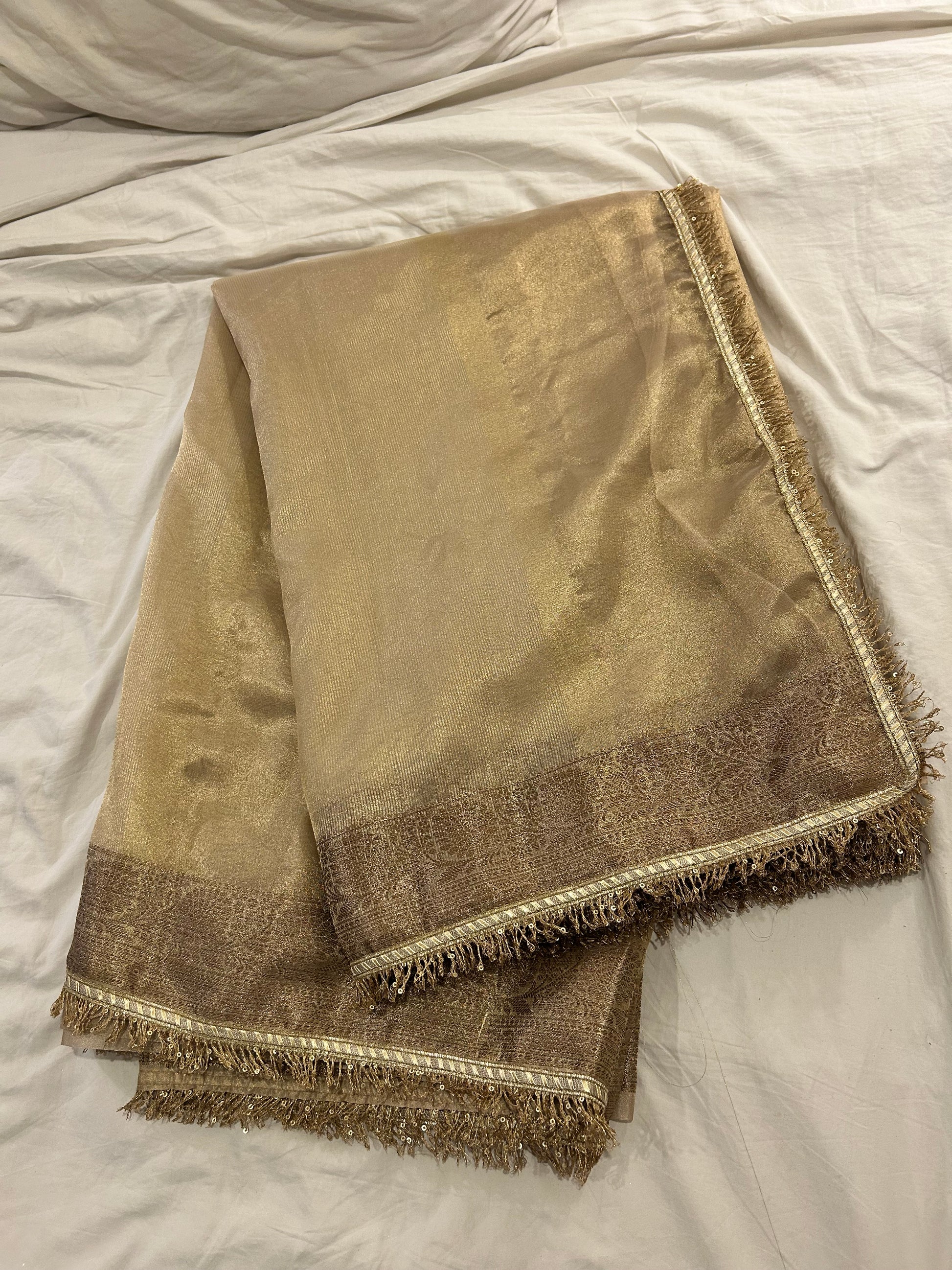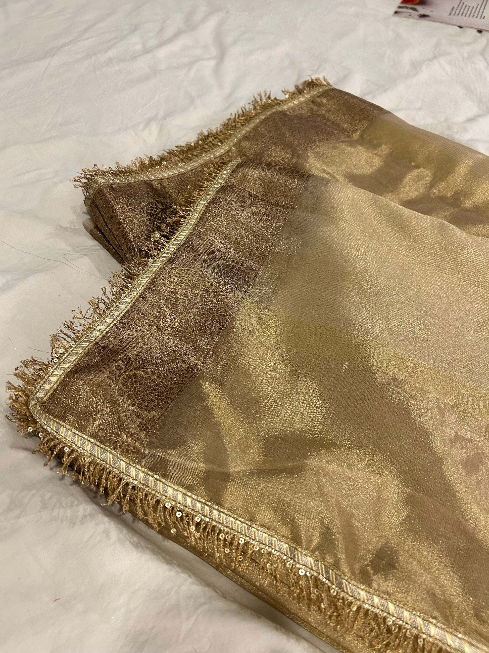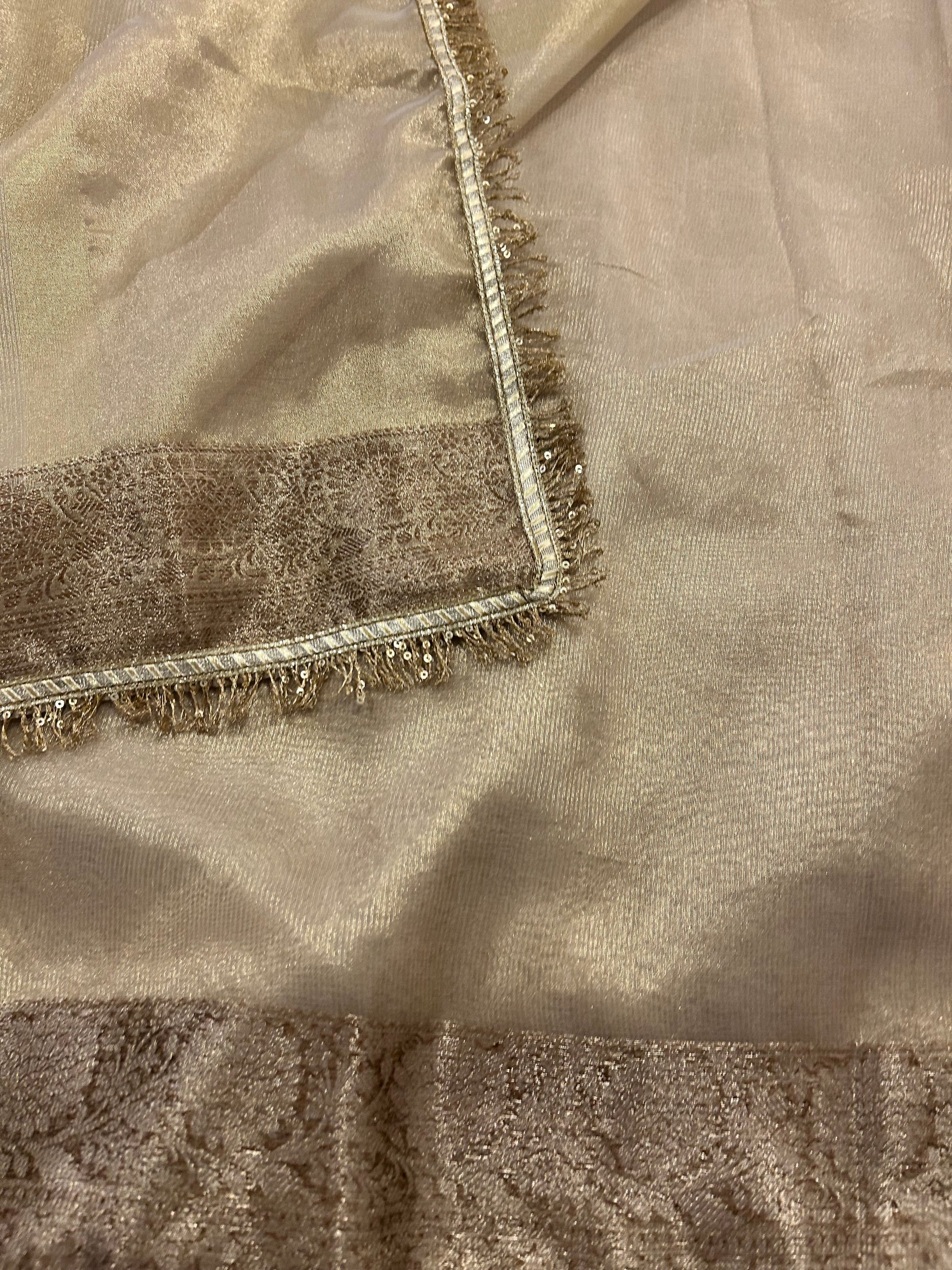 Introducing the Shaam Ki Rangat Tissue Saree, an enchanting blend of subtlety and grace. This stunning champagne tissue silk saree captures the warm, golden hues of dusk, evoking a sense of timeless elegance. The lightweight, shimmering fabric drapes effortlessly, creating a soft and ethereal silhouette that enhances your natural beauty. Intricate zari work adds a touch of sophistication, reflecting light beautifully as you move.