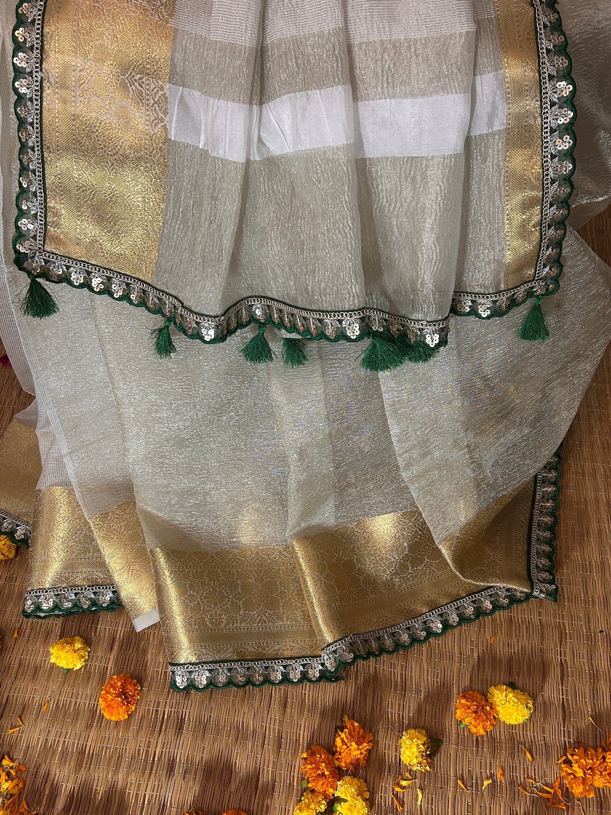 Shine like a star in our Sitara Tissue Saree, an enchanting piece that blends a modern metallic feel with a touch of traditional artistry. The fabric's lustrous silver hue drapes like liquid moonlight, creating a radiant silhouette that is both elegant and eye-catching.This exquisite saree is beautifully accented with a delicate green lace border that runs gracefully along the edges. The vibrant green embroidery on the lace provides a stunning contrast, adding a pop of color and a touch of nature-inspired beauty to the shimmering silver.